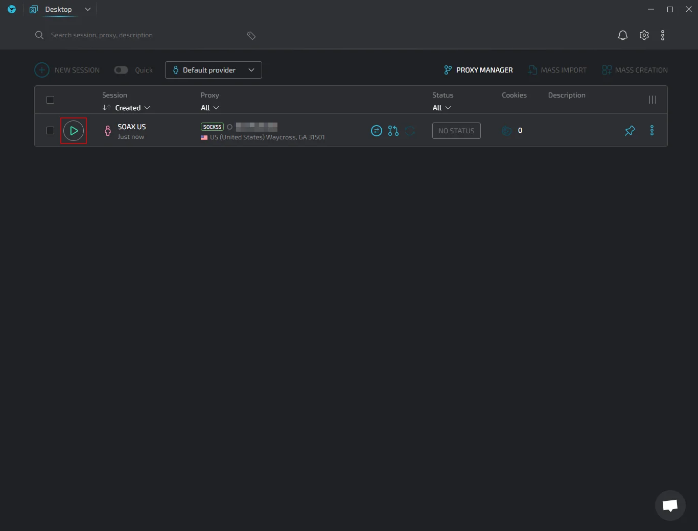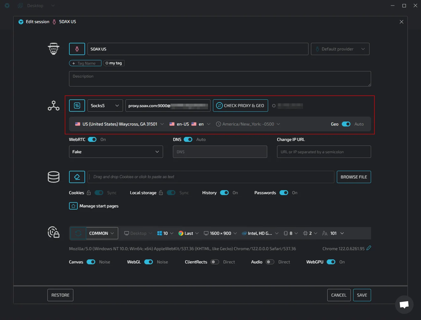 Give your session a name and choose the protocol that you want to use for your proxy. SOAX works with both HTTP(S) and SOCKS5. For easy setup, you can copy and paste your details in an "username:password@host:port" format. You can find this in your SOAX dashboard under "Proxy URI". Test your proxy and click "Save".