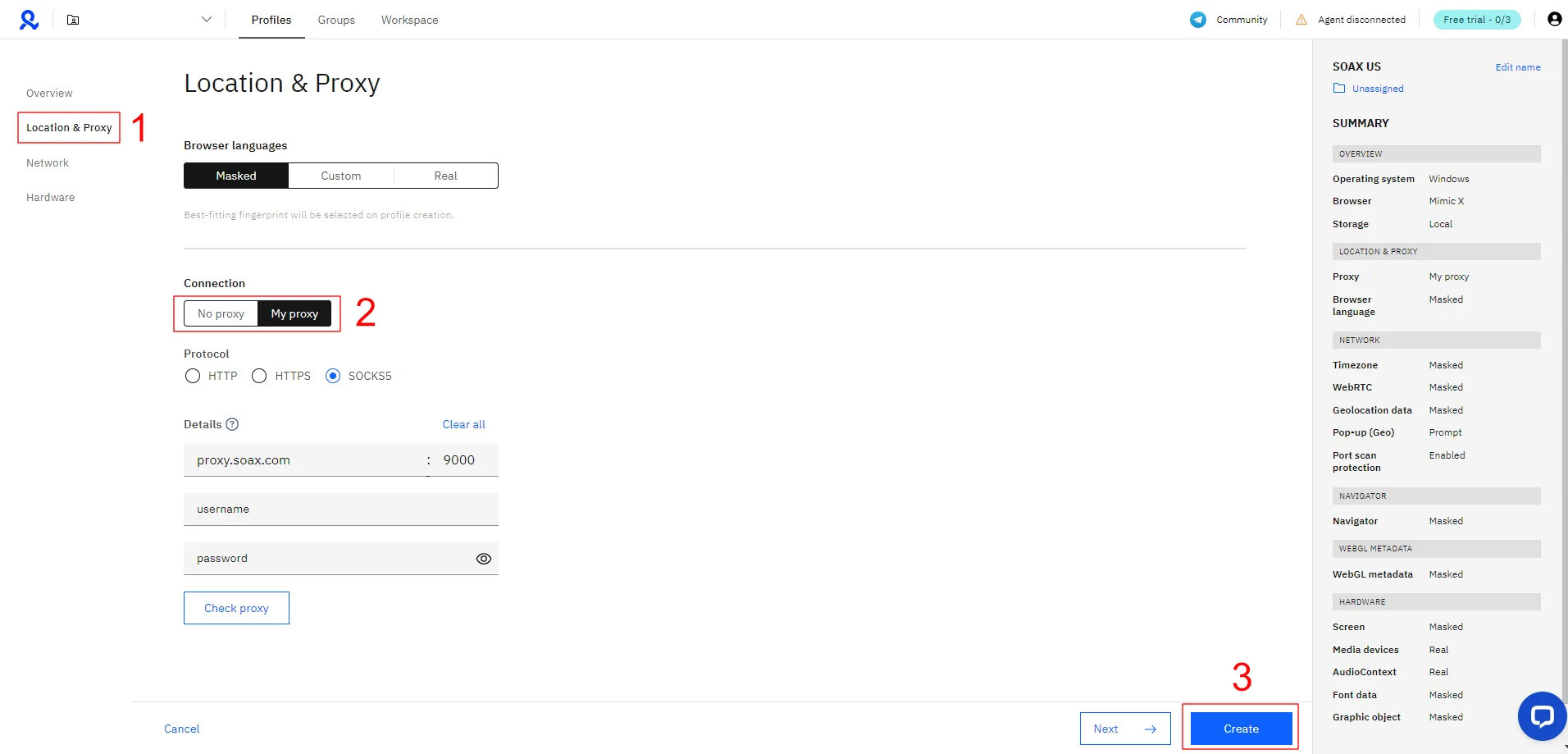 In the left-hand menu, click the "Location & Proxy" tab. Here you can add your SOAX proxy details. Under "Connection", select "My proxy" and add your SOAX username, password, host, and port. To check whether the details are correct, click "Check proxy". Finally, click "Create" to finalize the profile setup.